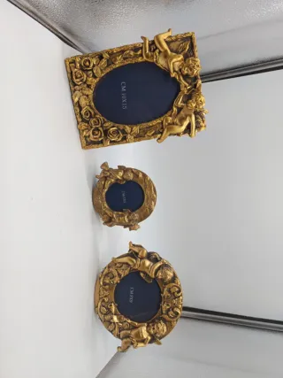 Elegante set di tre portafoto con decorazioni a tema angioletti e rose. - Finitura color oro. - Design classico e raffinato. - Ideali per decorare la casa o come regalo.