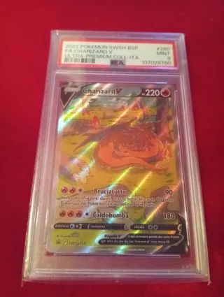 Carta Pokémon Charizard V del 2022, certificada por PSA con una puntuación de 9 (Mint). - Edición: SWSH BSP FA/Charizard V. - Colección: Ultra Premium Coll-ITA. - Número de carta: #260. - Grado PSA: 9 Mint. - Código de autenticación PSA: 107028760.