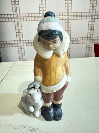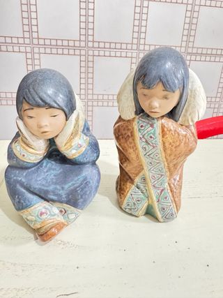 Deliziosa coppia di statuine raffiguranti bambini Inuit, realizzate in ceramica. Altezza cm 18 - Dettagli curati nei vestiti e nei volti. - Finitura smaltata.
