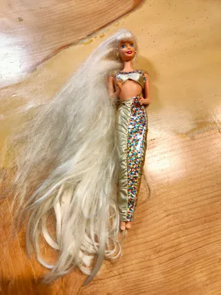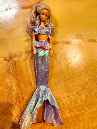 Bambola Barbie sirena con lunghi capelli biondi. Collo, piedi e mani perfette. Ha orecchini e anello, made in Indonesia.