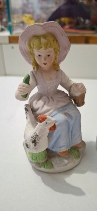 Set di tre statuine in porcellana raffiguranti figure in abiti d'epoca. - Una figura femminile con cappello rosa e un'oca. - Un ragazzo con cappello di paglia e un cane. - Una figura femminile con fiori. - Un uomo con abiti eleganti e un fiore.