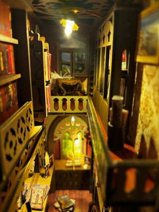 Miniatura di una casa delle bambole, perfetta da inserire in una libreria. - Design dettagliato a tema libreria e camino. - Struttura in legno intagliato. totalmente assemblata a mano pezzo per pezzo. illuminazione interna data da un sistema a batterie con due 2032 già incluse