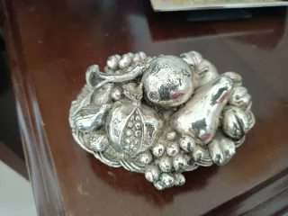 Bellissimo cesto decorativo a forma di frutta, realizzato in argento. - Design dettagliato con vari tipi di frutta. - Finitura lucida in argento.
