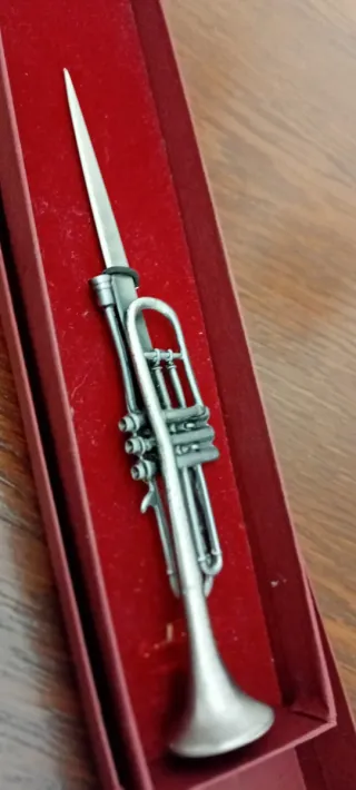 Tagliacarte vintage in peltro soggetto "tromba", ottime condizioni. Lunghezza 17 cm.