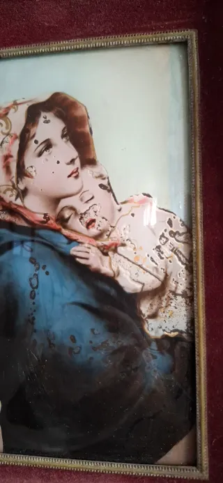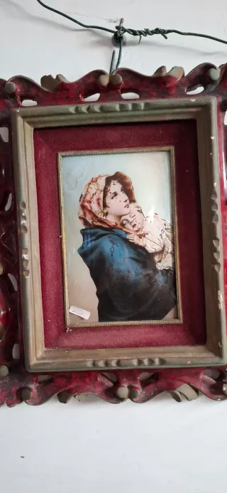 Bellissimo quadro vintage raffigurante la Madonna col Bambino. - Cornice decorata in rosso e oro. - Sfondo interno in velluto bordeaux. - Stampa colorata con finitura lucida.