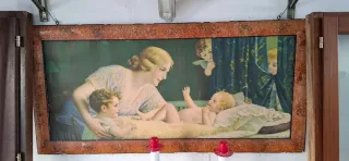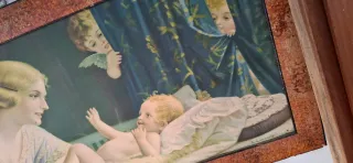 Bellissimo quadro antico con una scena tenera di madre, bambini e angeli. - Cornice decorata. - Raffigurazione artistica con dettagli curati. - Ideale per collezionisti o amanti dell'arte classica.
