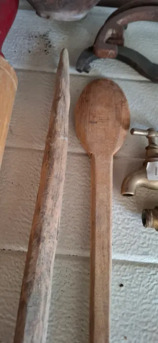 Lotto di cinque utensili vintage in legno. - Mattarello con manico rosso. - Cucchiaio in legno. - Strumento appuntito in legno. - Pezzo di legno grezzo. - Utensile da trapano in metallo.