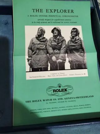 Brochure originale Rolex The Explorer dedicata ai conquistatori dell'Everest. Libretto vintage molto raro ed in ottime condizioni - The Explorer A Rolex Oyster Perpetual Chronometer. - Specialmente progettato per scopi spedizionari. - Foto dei conquistatori dell'Everest: Sir Edmund Hillary, Brig. Gen. Sir John Hunt, Sherpa Tensing G.M. - The Rolex Watch Co. Ltd. Geneva-Switzerland (H. Wilsdorf, Founder & Chairman). - Elenco delle sedi Rolex nel mondo.