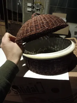 Elegante contenitore in ceramica con cestino intrecciato. - Materiale: ceramica e vimini. - Design rustico e funzionale.