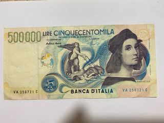 Banconota italiana da 500.000 Lire, raffigurante il ritratto di Raffaello. in buono stato di conservazione come da foto.
