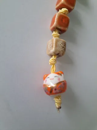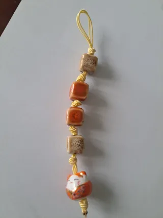 Grazioso portachiavi con un gatto della fortuna in ceramica. - Decorato con dettagli colorati. - Perline quadrate in ceramica. - Cordino giallo.