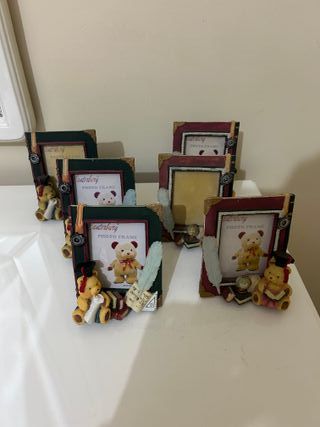 Vendo set di 6 cornici portafoto della celebre linea Canterbury. Il set comprende: • 3 Cornici Verde Bosco (dettagli con orsetto laureato, pergamena e libri) • 3 Cornici Rosso Amaranto (dettagli con orsetto, mappamondo e piuma). - Design con orsetti in toga e cappello da laureato. - Dettagli con libri, piume e strumenti di scrittura. - Angoli decorativi dorati.