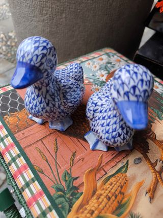 coppia di papere bianche con decoro blu stile Herend "la maison de porcelain" dipinte a mano. H 11 cm