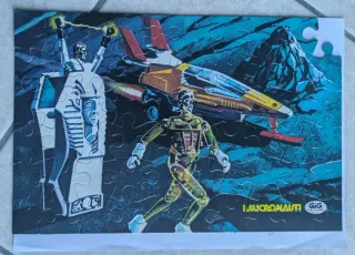 Puzzle raffigurante un'epica battaglia spaziale con astronavi e personaggi dei Micronauti. Un pezzo da collezione per gli appassionati. Era un Puzzle promozionale dei Micronauti offerto da Ergo Spalma negli anni 70-80, composto da 4 puzzle da 60 pezzi ognuno di 20 X 30 cm ognuno. 2 puzzle sono completi. 2 puzzle sono mancanti di 1 pezzo come visibile in foto Scatole originali disponibili, con segni del tempo Vendo in blocco Possibile ritiro a mano