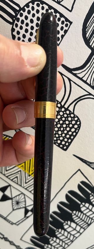 Elegante penna stilografica con finitura marrone screziato e un anello dorato. - Corpo della penna in resina marrone. - Dettaglio di un anello in metallo dorato. - Cappuccio arrotondato.