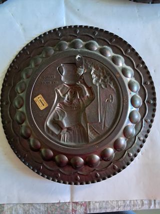 Piatto decorativo in rame con un'immagine incisa. - Raffigura una donna con un vaso sulla testa e una fontana. - Presenta la scritta Ricordo del Molise. - Bordo decorato con motivi a onde e cuoricini. Piatto vintage da parete in rame, Ricordo del molise Ciccarella diametro 24 cm peso 220 grammi