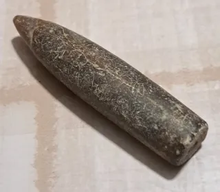 Campione di rostro di belemnite fossile. - Forma conica allungata. - Superficie con texture e venature caratteristiche. - Colore marrone scuro con sfumature più chiare.