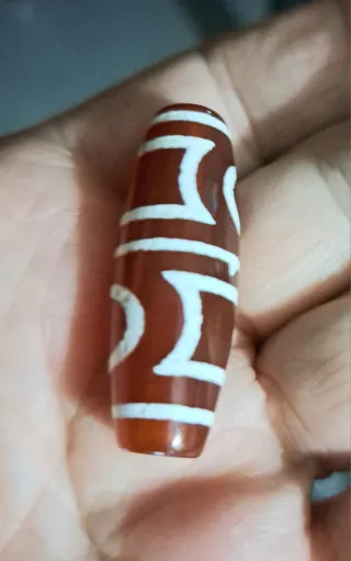 Perlina Dzy tibetana vintage con un diseño distintivo. - Color base marrón rojizo. - Motivos blancos decorativos. Dzy tibetana misura in fotografia