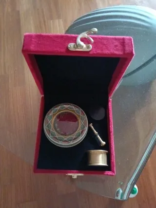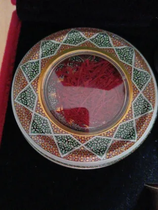 Scatola con fili di zafferano puro premium sigillata, un mortaio e un pestello. Perfetto per conservare e macinare lo zafferano. - Scatola in velluto rosso - Mortaio e pestello in ottone - Scatola decorata con motivi tradizionali