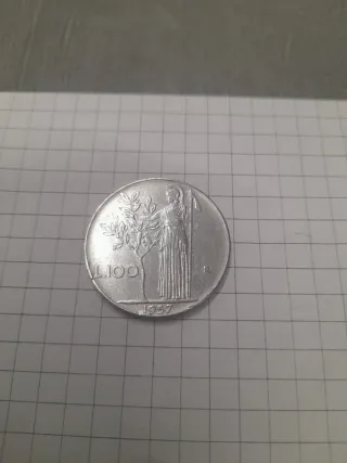 Moneta da 100 Lire del 1957. - Dritto: Figura femminile con ramo d'ulivo. - Rovescio: 100 LIRE e anno 1957.