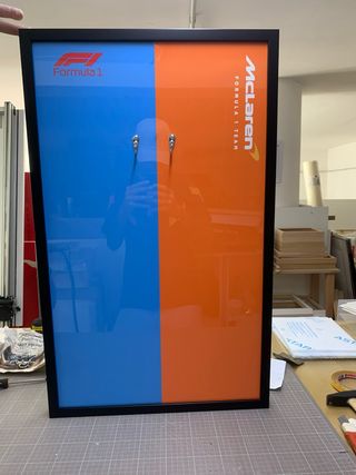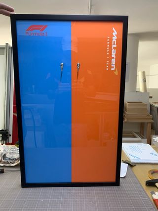 Espositore da parete con design diviso nei colori iconici del team McLaren di Formula 1. - Metà blu con logo Formula 1. - Metà arancione con logo McLaren Formula 1 Team. quadro con cornice in legno massello 45x75 cm con display stampato in fine art e vetro plexi forato. I ganci sono già inseriti da noi, bisognerà solo appendere l’auto lego. il modellino non è incluso nella vendita spedizione con imballaggio sicuro