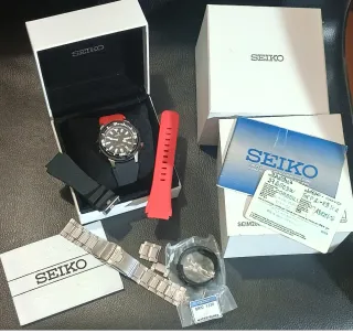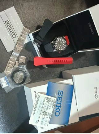 Orologio subacqueo Seiko Baby Tuna SRP229K1 con movimento automatico. Questo modello presenta una cassa robusta e un design distintivo. - Cassa in acciaio inossidabile. - Cinturino in gomma nera. - Cinturino in gomma rossa - Lunetta girevole unidirezionale. - Quadrante nero con indici luminosi. - Datario. - Resistente all'acqua fino a 200 metri. - Include bracciale in acciaio Seiko originale e tutte le maglie aggiuntive. Ghiera aggiuntiva Full set Documenti e card Scatola e contro scatola Scontrino originale Affare