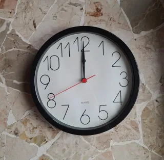 Orologio da parete con un design pulito e moderno. - Cornice nera. - Quadrante bianco con numeri neri. - Lancette rosse e nere.