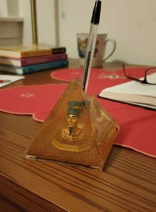 Elegante portapenne a forma di piramide con effige di faraone. - Design unico a piramide. - Dettaglio di un faraone. - Base con glitter dorati.