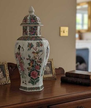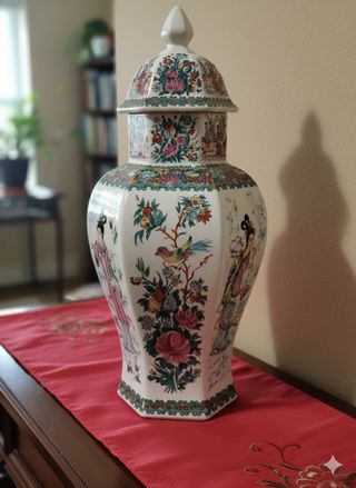 Elegante vaso cinese con coperchio, finemente decorato. Presenta scene con figure femminili e motivi floreali. - Decorazioni policrome. - Design esagonale. - Coperchio con pinnacolo decorativo. Come foto dei puntini nel coperchio