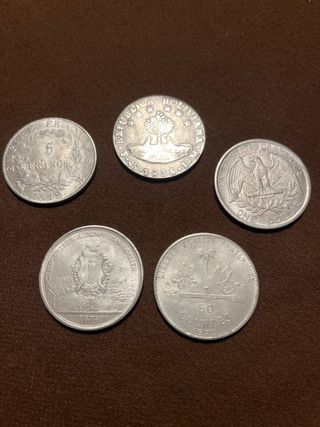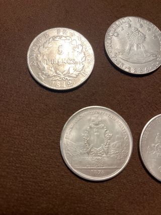 Lotto composto da 5 monete antiche di diverse nazioni e date. - Moneta da 5 Franchi, anno 1842. - Moneta Republica Boliviana, Bolivar anno 1835. - Moneta United States of America, One Dollar. - Moneta Eidgenossisches Schützenfest in Sellen, anno 1874. - Moneta Liberte Egalite Fraternite, 50 Gourdes, anno 1975.
