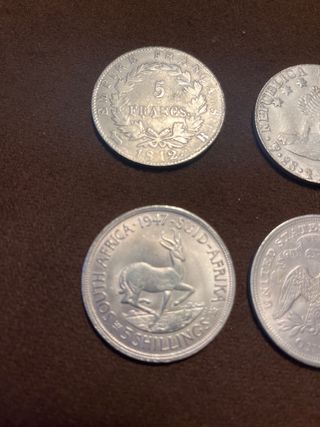Lotto composto da 4 monete antiche ti varie nazioni e annate: - Moneta da 5 Franchi, Impero Francese, anno 1812. - Moneta da 5 Shillings, Sud Africa, anno 1947. - Moneta da 1 Dollaro, Stati Uniti d'America. - Moneta Repubblica Boliviana, Bolivar anno 1835.