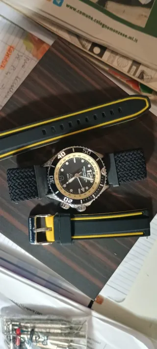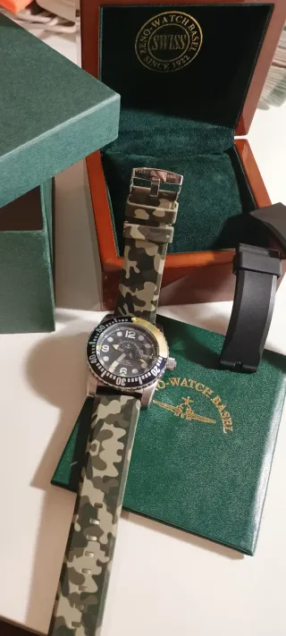 Orologio Zeno Watch Basel automatico, Swiss Made. - Cassa in acciaio e lunetta in oro. - 2 cinturini in gomma uno mimetico camouflage e l'altro nero - Scatola originale in legno e controscatola. Full set con documenti e certificato