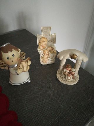 Set di statuette in ceramica raffiguranti natività sacra famiglia e angioletto - Statuette di un angelo con arpa. - Natività con Sacra Famiglia. - Croce con Sacra Famiglia.