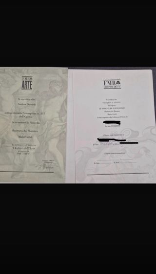 Certificato di autenticità per l'esemplare n. 357 dell'opera Le avventure di Pinocchio, illustrata dal Maestro Mario Ceroli. - Esemplare n. 357. - Illustrazioni di Mario Ceroli. - Opera: Le avventure di Pinocchio. - Certificato FMR & GRUPPO ARTE. Regalo per mio figlio non gradito( era per la comunione) rivendo al prezzo di acquisto , accetto offerte non troppo distanti