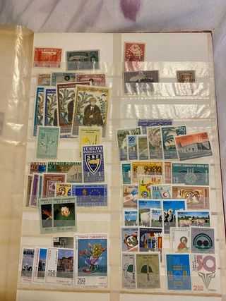 Album di francobolli della Turchia, con diverse emissioni. - Francobolli con immagini di paesaggi e personaggi. - Alcuni francobolli riportano la dicitura Türkiye Cumhuriyeti Postaları. - Presenti francobolli con valori come 40, 50, 60, 75, 100, 250 kuruş. Mix di francoboli , fate voi offerta