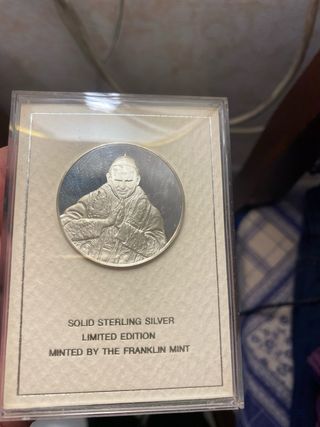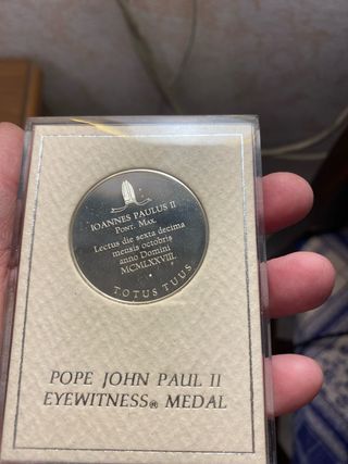 medaglia commemorativa di grande interesse storico e devozionale, dedicata all'elezione di Papa Giovanni Paolo II. È realizzata in argento sterling massiccio (Solid Sterling Silver), ovvero argento con una purezza del 92,5%. • Produttore: È stata coniata dalla Franklin Mint, una celebre zecca privata nota per le sue edizioni limitate e oggetti da collezione.la cifra e’ simbolica valuto offerte . Pesa 20g!!