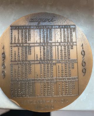 medaglione-calendario vintage in bronzo del 1969, probabilmente commissionato come regalo commemorativo o "calendario da tasca"Aerzener si riferisce alla Aerzener Maschinenfabrik, una celebre azienda tedesca produttrice di soffianti e compressori. • Savoia Milano era la filiale o il partner italiano con sede a Milano. Questa medaglia è stata probabilmente regalata come ringraziamento aziendale alla fine del 1968.Il 1969 è stato l'anno dello sbarco sulla Luna, il che rende ogni oggetto a tema "celeste" o "spaziale" di quell'anno particolarmente nostalgico.