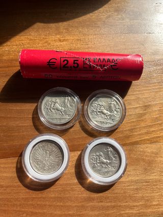 Lotto composto da 4 monete del regno d’argento e da rotolino da 5 centesimi di Euro grecia 2002+ 4 monete non catalogate possibili riconi (presenti nella seconda foto) - Monete originali della Grecia. - Valore nominale: 5 centesimi di Euro. - Presenti in un rotolo da 2,5 Euro.