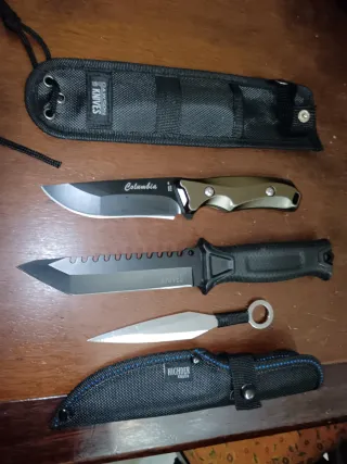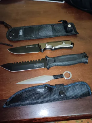 Set di coltelli di varie marche e modelli. - Coltello con lama Columbia - Coltello con lama seghettata Knives - Coltello da lancio Highder - Fodero in nylon per coltello Dawson - Fodero in nylon per coltello Highder
