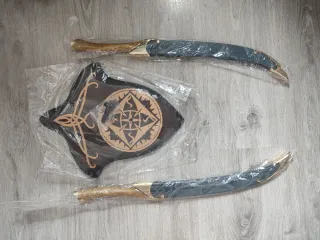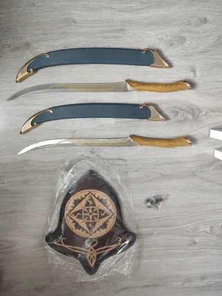 Set di repliche dei coltelli elfici di Legolas. Sempre conservati, non li ho nemmeno esposti. Lame da 56 cm, include espositore in legno e guaine. Design curvo caratteristico, impugnatura dorata, fodero con dettagli. Include due coltelli e una daga.