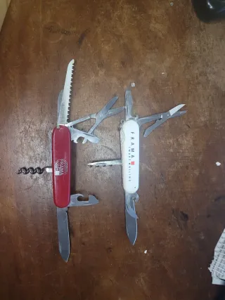 Prezzo per ciascuno. Si vendono due coltelli, uno del marchio Aitor e uno multiuso del marchio Rostfrei. - Coltello Aitor di colore granato. - Coltello Rostfrei multiuso di colore rosso.