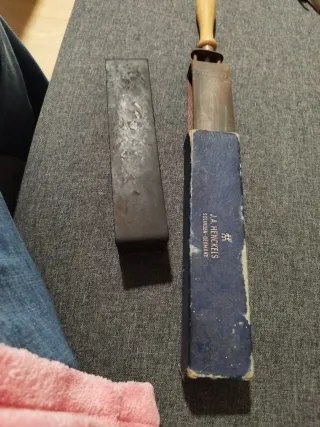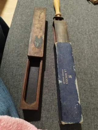 Affilatore per coltelli antico del marchio J.A. Henckels. E un altro artigianale antico con spazio per il coltello. Include la scatola originale. Fabbricato a Solingen, Germania.