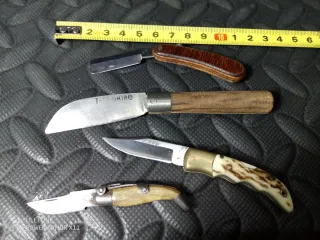 Lotto composto da tre coltelli vintage, ideali per collezionisti o appassionati. - Manici in legno e metallo. - Diverse forme e dimensioni.