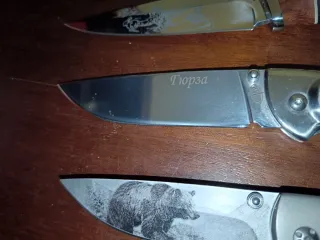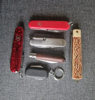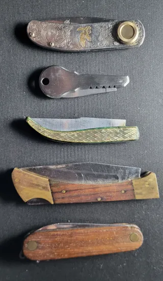 Set di cinque coltelli tascabili di diversi stili e dimensioni. - Coltello Albainox con blocco con incisione e dettagli dorati. - Coltello JKR tipo chiave nuovo. - Coltello con manico testurizzato dorato. - Coltello con manico in legno e dettagli metallici con blocco. - Coltello multiuso con manico in legno, cavatappi e apribottiglie. Tutti usati tranne il JKR tipo chiave, anche se sono ben curati.