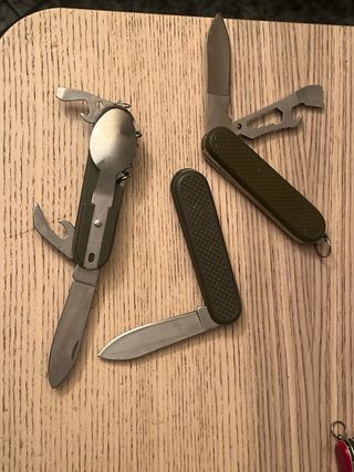 Set di strumenti e coltelli in stile militare. - Coltello multiuso con apertura e sega. - Coltello tascabile con lama in acciaio. - Utensile da campeggio con cucchiaio e forchetta.