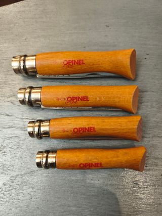 Confezione da cinque coltelli Opinel. - Modello 1 Nº6, 1 del 07, 2 del 08 e 1 del 09 - Impugnatura in legno. - Prodotto a Savoye, Francia.