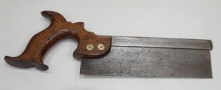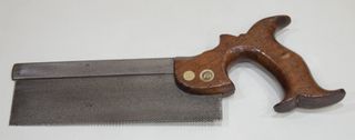 ANTICA SIERRA INGLESE PER COLTELLI MILANESI. METÀ DEL XIX SECOLO. Manico in faggio con split nuts in ottone. Uno di essi con un sigillo che indica 'warranted superior' e lo stemma britannico. Lunghezza totale di 32,5 cm. Lama di 20 cm.
