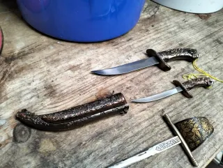 Set di apriscatole e coltelli decorativi. Design ornamentale sui manici, fodero in rame con incisioni, lama in metallo con dettagli, impugnatura con motivi dorati.