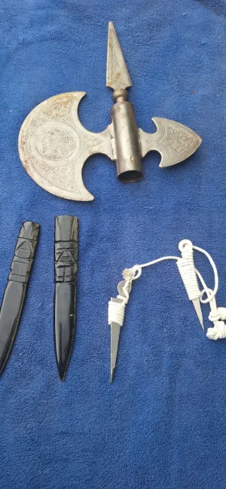 Set composto da un'alabarda manuale a forma di ascia in stile medievale e due coltelli in ceramica. - Ascia con dettagli ornamentali. - Due coltelli in ceramica con manici neri.