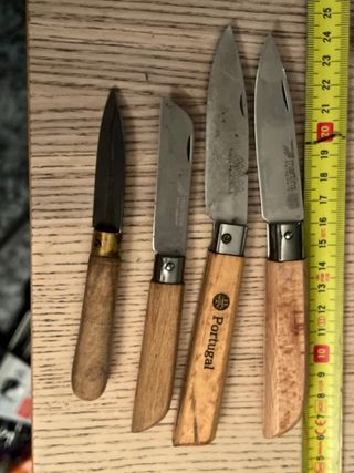Set di quattro coltelli classici con manici in legno. - Coltello con manico in legno e dettagli metallici. - Coltello con manico in legno. - Coltello Portugal con manico in legno. - Coltello Martins con manico in legno.